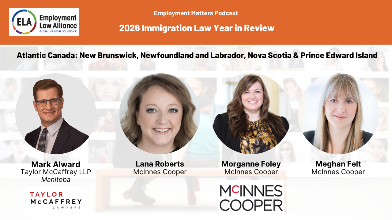 106: Speaker: Kiersten Amos ( McInnes Cooper / Nova Scotia) kiersten.amos@mcinnescooper.com Join ELA thought leaders as they address the most impactful labor and employment changes of 2025 and anticipated developments in 2026. To view other Atlantic Canada jurisdictions, click on the jurisdiction below: New Brunswick Newfoundland and Labrador Prince Edward Island Learn more and register for these complimentary webinars, podcasts, and vlogs: https://webinars.ela.law/2026-year-in-review